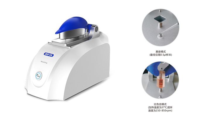 2、打開(kāi)Micro Drop軟件,并選擇核酸應用程序。用移液器滴加1μl緩沖液(溶解待測樣品的液體)至樣品基座光學(xué)表面,選擇“空白檢測”以執行空白測量。一旦空白測量完成后,用實(shí)驗室潔凈無(wú)絨紙將上樣檢測系統的上部和下部的光學(xué)表面擦拭干凈。