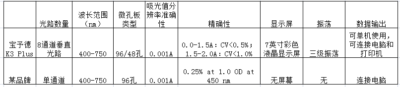 另外,我們用數據說(shuō)話(huà),對比某著(zhù)名品牌同類(lèi)型酶標儀,各水平參數如下: